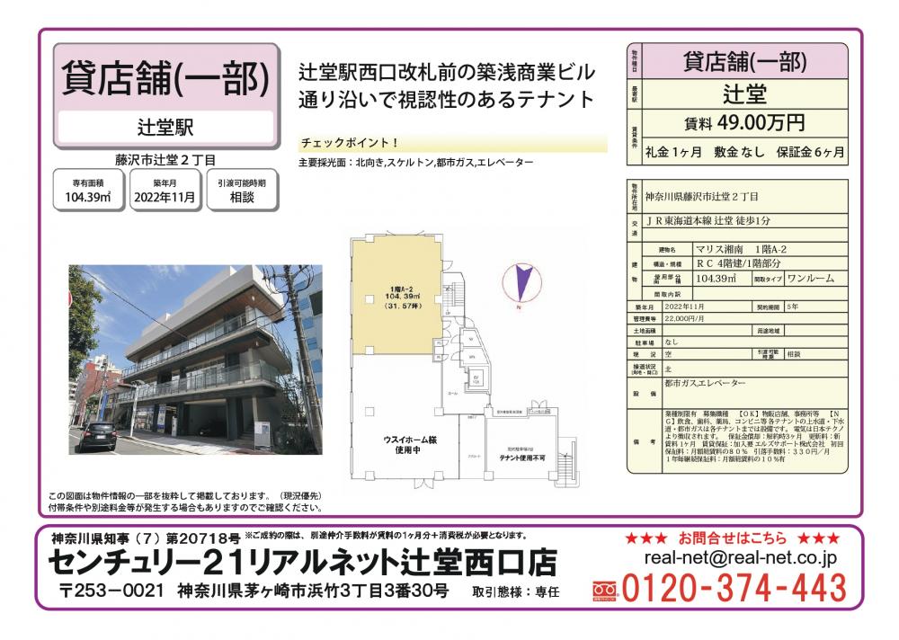 JR東海道線「辻堂」駅西口改札より徒歩1分!!