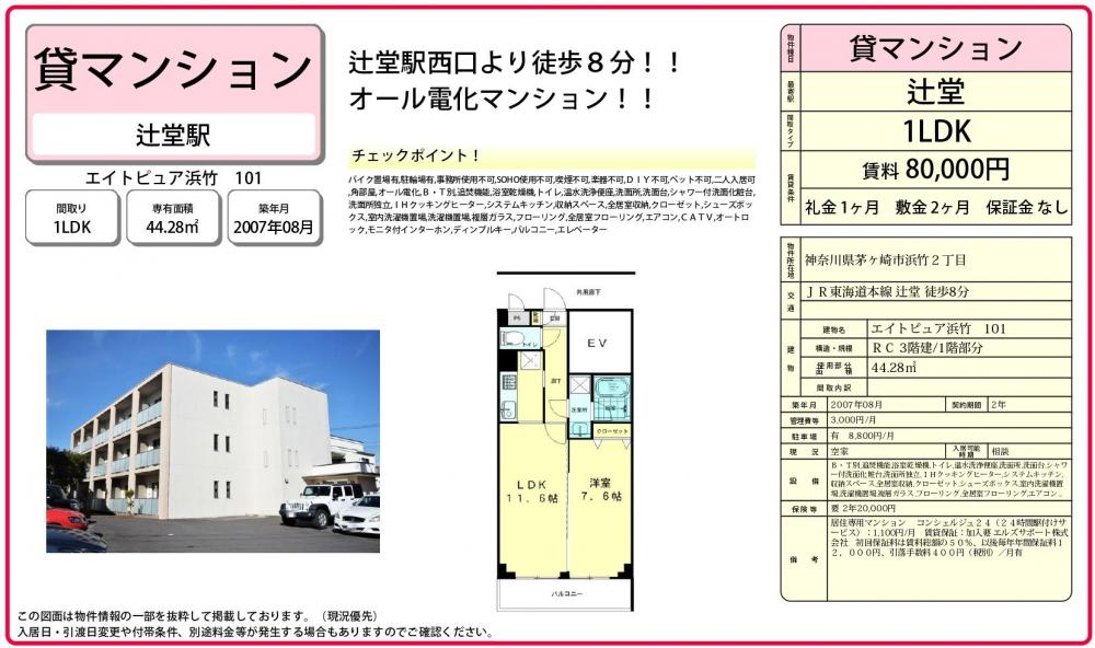 辻堂駅徒歩8分!オール電化賃貸マンション!エイトピュア浜竹101号室